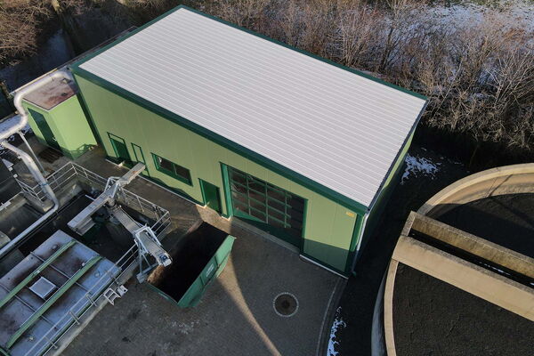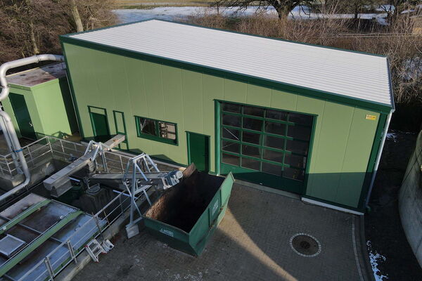 Auf einer Erweiterungsfläche haben wir eine Halle errichtet, welche die verschiedenen Module der Schlammentwässerung beherbergt: