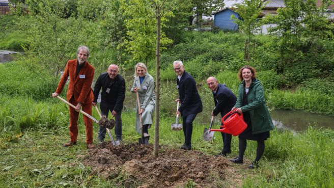 Wir freuen uns, zu diesem 75-jähirgem Jubiläum gratulieren zu können und zu diesem Anlass, ganz im Sinne der Nachhaltigkeit, keine klassischen Blumen, sondern einen Baum überreichen zu können. Neben „unserem“ Baum wurden 74 weitere Bäume von Partner:innen aus der Wasserwirtschaft gespendet und in Düsseldorf, dem Geburtsort der DWA, zur Aufwertung der innerstädtischen Bäche, gepflanzt.